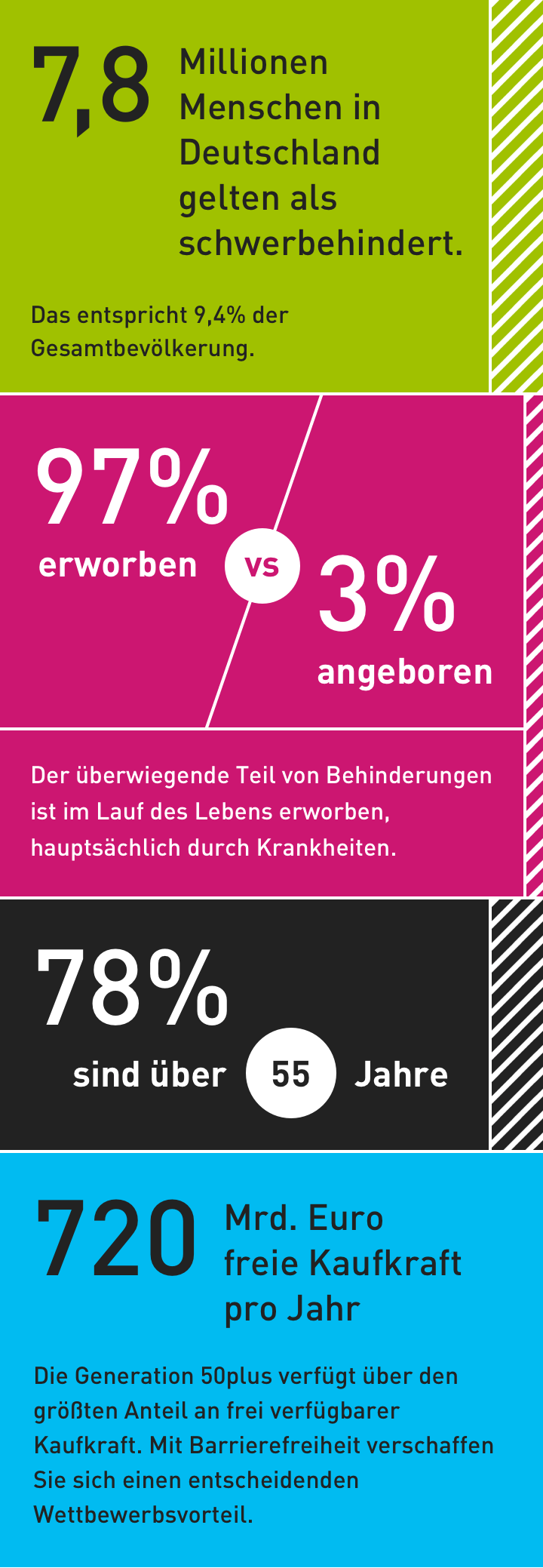 Sie erreichen zahlungskräftige Zielgruppen schon heute, die ihre Mitbewerber nicht optimal bedienen: Menschen mit Behinderung, Menschen der Generation 50plus sowie Menschen mit vorübergehenden und situationsbedingten Einschränkungen.